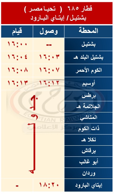 وجاءت كالتالي: قطارات (663 – 685- 687 - 693 - 666- 674 - 678 - 692 ) وذلك إعتباراً من يوم الأربعاء الموافق 12/3/2025 ، ويترتب علي ذلك تعديل مواعيد قطارات أرقام ( 682-677-669) طبقاً للجداول المرفقة وباقي القطارات تسير طبقا لجداولها الحالية.