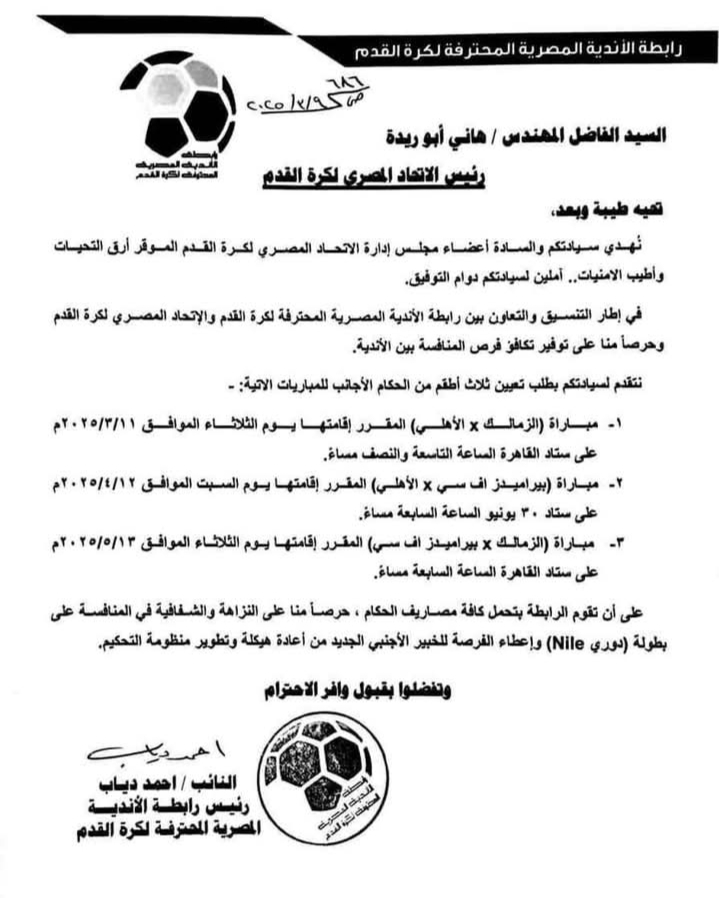 تقدمت رابطة الأندية المصرية بطلب لاتحاد الكرة لإسناد ثلاث مباريات ببطولة الدوري المصري الممتاز إلى طاقم تحكيم أجنبي.