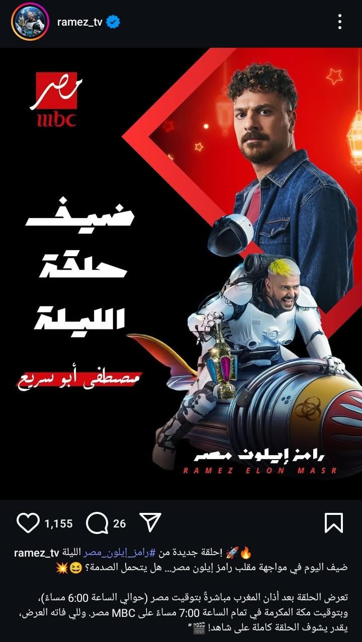 وأعلن الفنان رامز جلال عن استضافته لـ مصطفي أبو سريع، وذلك من خلال حسابه الرسمي عبر موقع تبادل الصور والفيديوهات القصيرة "إنستجرام"، وعلق: “حلقة جديدة من رامز إيلون مصر الليلة .. ضيف اليوم في مواجة مقلب رامز إيلون مصر .. هل يتحمل الصدمة؟”.