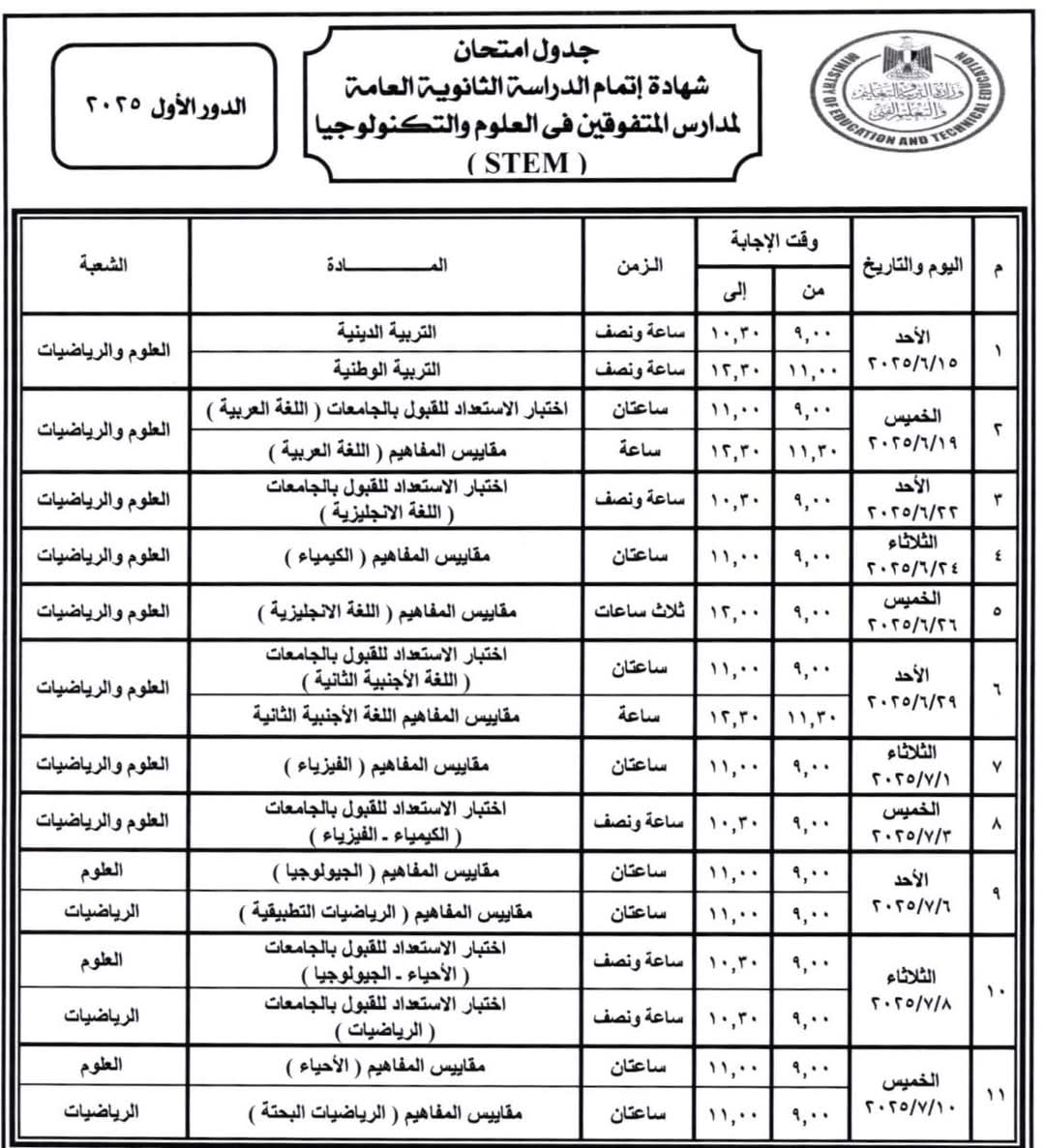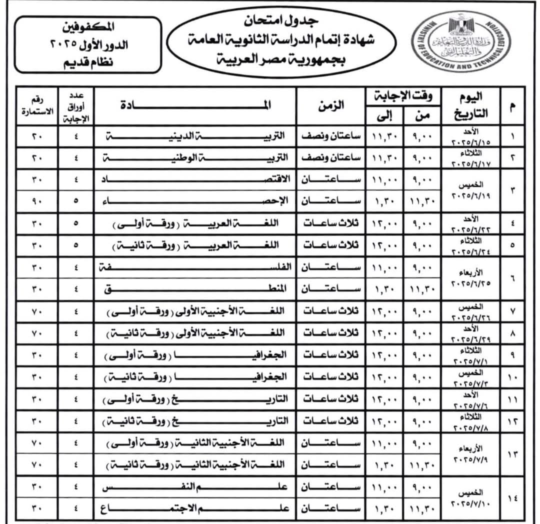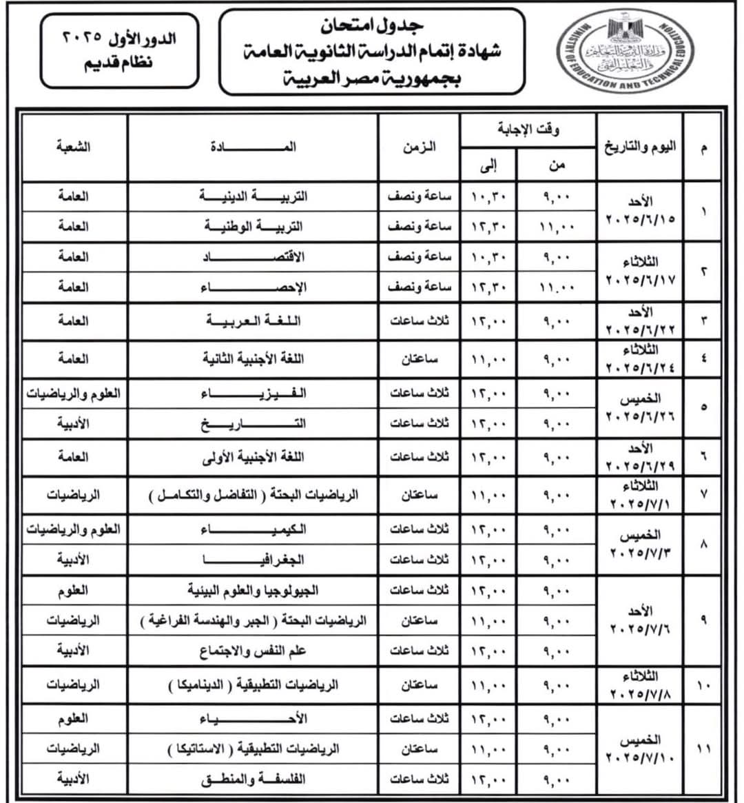 وبحسب جدول امتحانات الثانوية العامة تبدأ الامتحانات يوم الأحد الموافق 15 يونيو 2025، وتستمر حتى يوم الخميس 10 يوليو 2025.