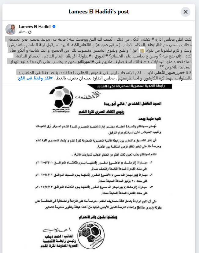 وقالت الحديدي عبر حسابها على فيسبوك: "كنت أظن مجلس إدارة الأهلي أذكى من ذلك.. نُصب لك الفخ ووقعت فيه: قرعة فى موعد عجيب فجر الجمعة! خطاب رسمي من الرابطة بالحكام الأجانب واتحاد الكرة لا يرد ثم يقول ليلة الماتش ما عنديش وقت ولازم تبلغونا من بدرى.. "فخ " واضح وضوح الشمس منصوب لك من الجميع وإنت شايفه وأتكرر قبل كده.. إزاي تقع فيه؟".