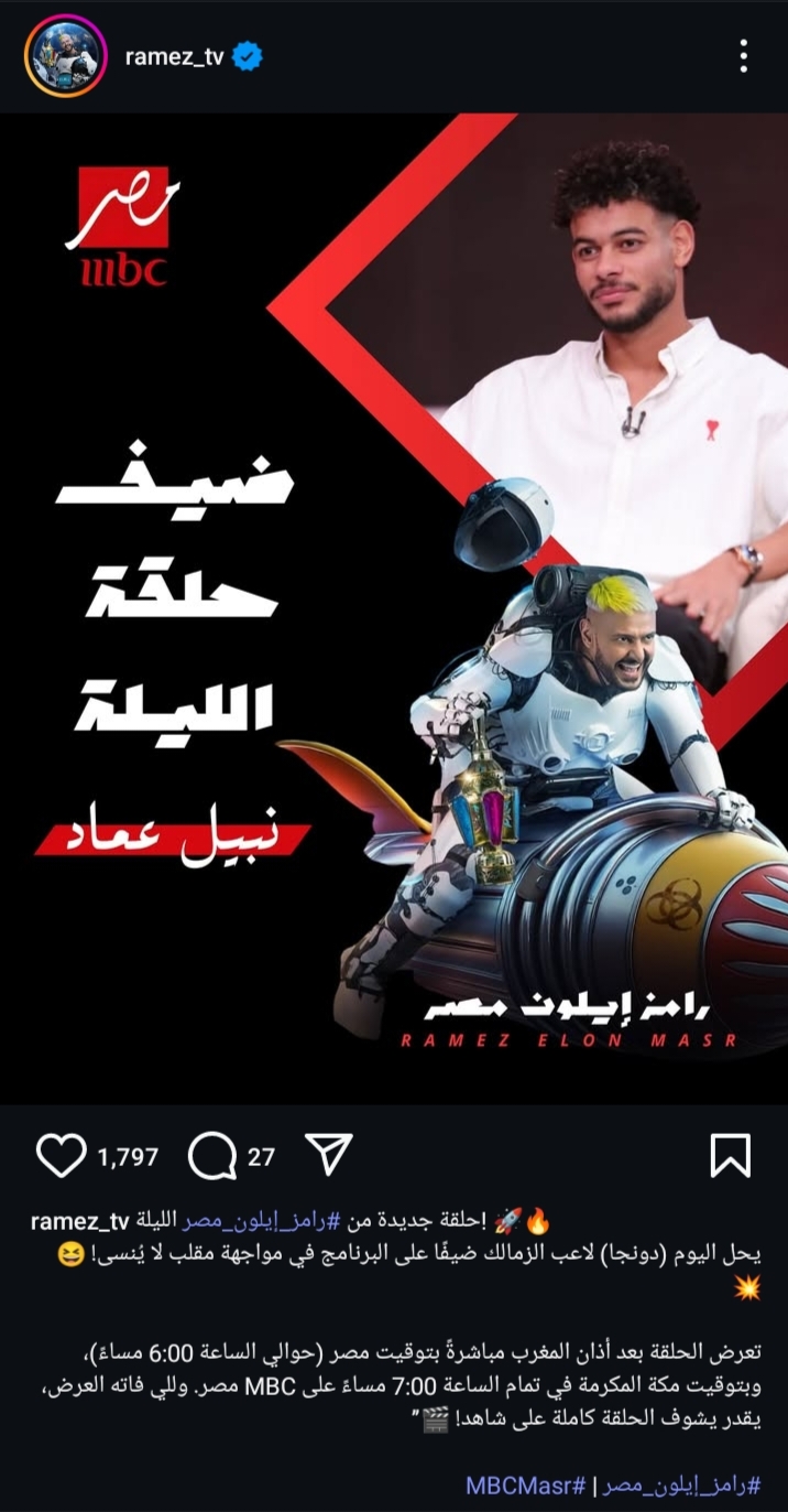 برنامج رامز إيلون مصر.. يحل لاعب كرة القدم في النادي الزمالك نبيل عماد دونجا ضيف الحلقة الـ12 من برنامج رامز إيلون مصر مع الفنان الكبير رامز جلال.