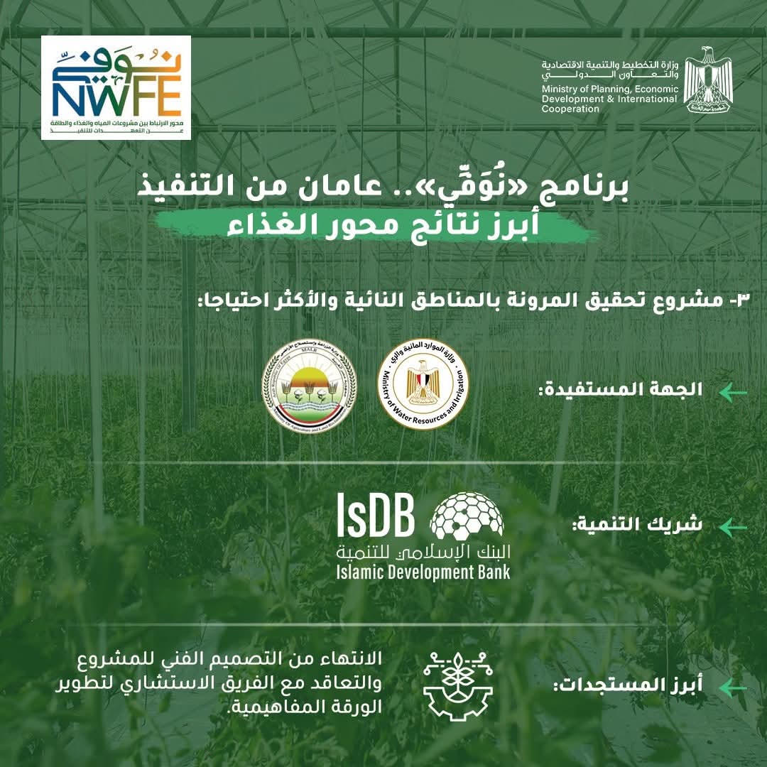 كما تطرق التقرير إلى (مشروع تحقيق المرونة بالمناطق النائية والأكثر احتياجا)، الذي تنفذه وزارتي الزراعة واستصلاح الأراضي، والري والموارد المائية، بالتعاون مع البنك الإسلامي للتنمية، حيث تم تحديد المناطق الجغرافية للمشروع وفقا لاحتياجات وأولويات الجهات المصرية المعنية ومراعاة التوزيع العادل للمشروعات على كافة مناطق الجمهورية مع إيلاء الاهتمام للمناطق الأكثر عرضة للتغيرات المناخية وتحقيق أقصى استفادة من تدخلات المشروع لتشمل محافظات الوادي الجديد والجيزة مع احتمالية ضم مناطق من وسط سيناء.