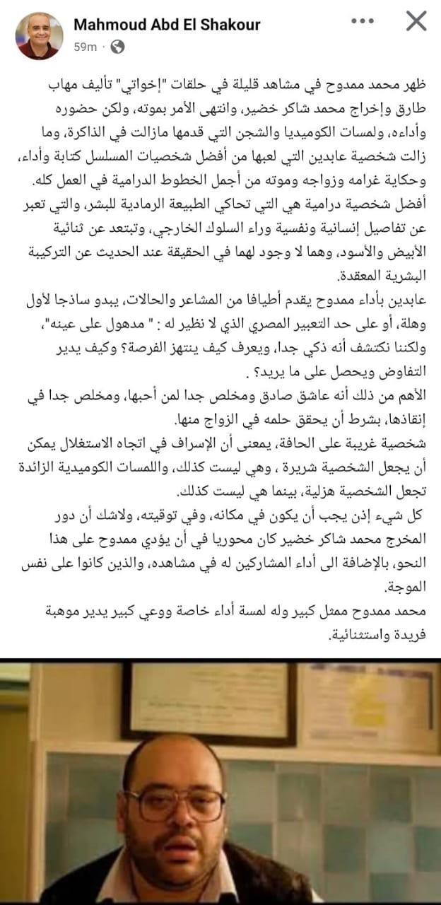 محمود عبد الشكور يشيد بـ دور محمد ممدوح في مسلسل إخواتي