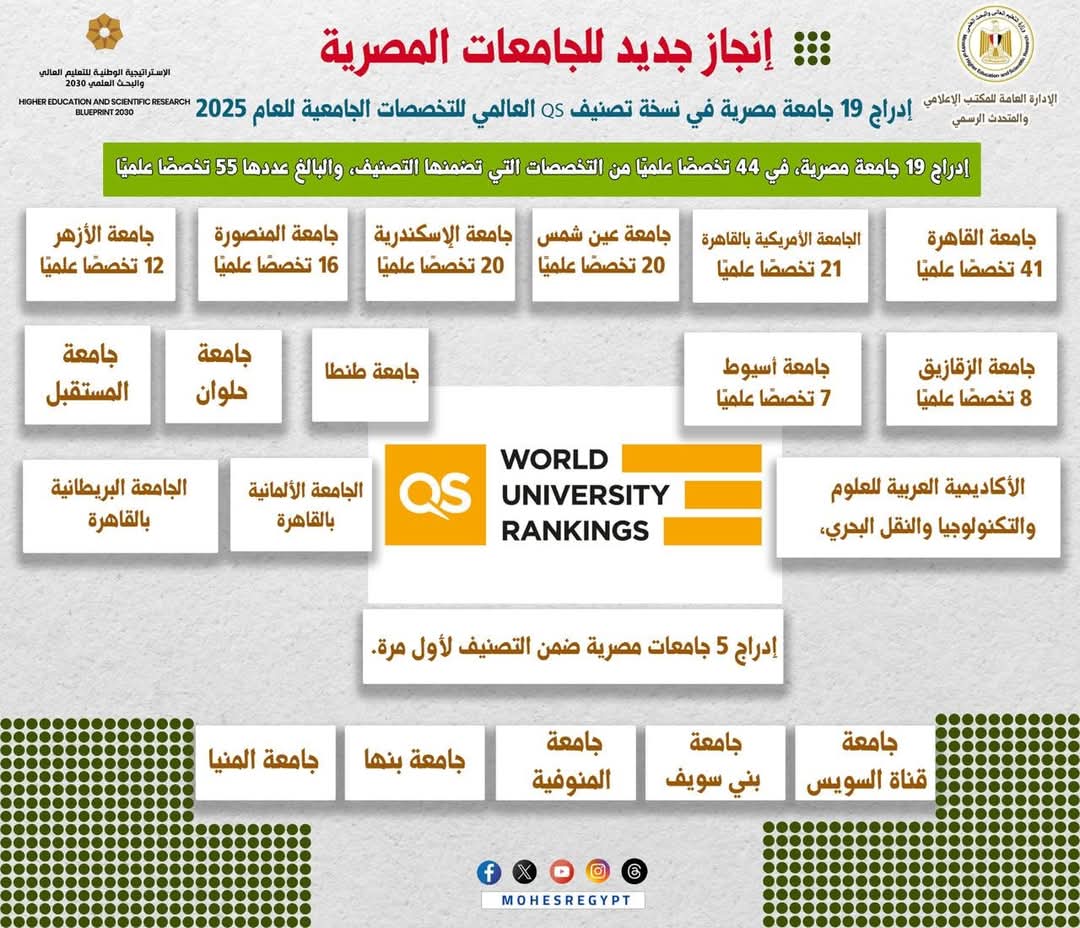 أعلن تصنيف QS العالمي نتائج نسخته للتخصصات الجامعية للعام 2025، والتي أظهرت إدراج 19 جامعة مصرية، في 44 تخصصًا علميًا من التخصصات التي تضمنها التصنيف، والبالغ عددها 55 تخصصًا علميًا، بزيادة في أعداد الجامعات المٌدرجة بالتصنيف عن العام الماضي، وكذلك زيادة كبيرة في أعداد الجامعات المصرية داخل كل تخصص علمي، فضلًا عن دخول 5 جامعات مصرية ضمن التصنيف لأول مرة.