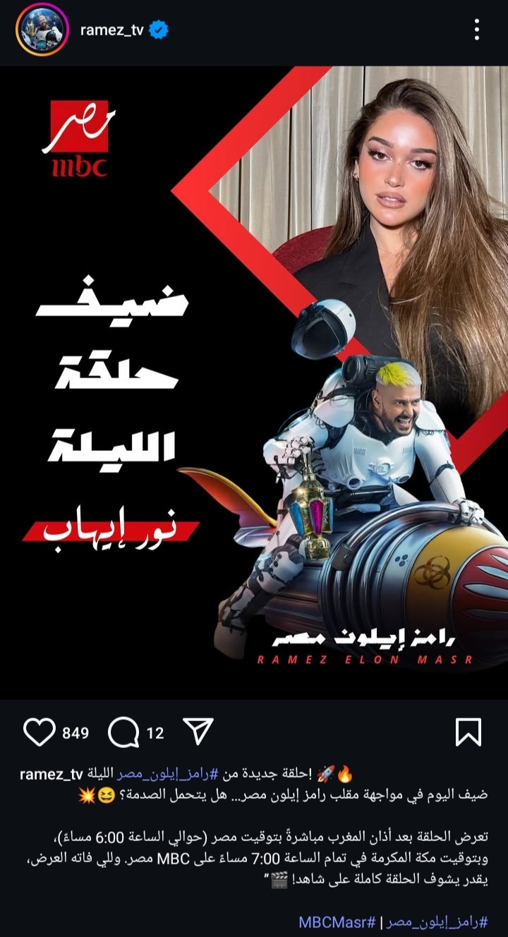 يستضيف برنامج رامز إيلون مصر الفنانة نور إيهاب في الحلقة 15 من البرنامج التي تعرض الليلة علي قناة mbc مصر بعد أذان المغرب مباشرة.