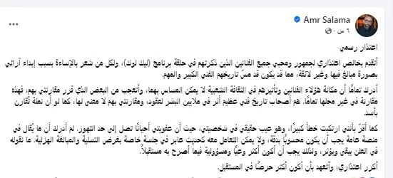 وكتب عمرو سلامة، عبر حسابه على فيسبوك: "اعتذار رسمي، أتقدم بخالص اعتذاري لجمهور ومحبي جميع الفنانين الذين ذكرتهم في حلقة برنامج (ليك لوك)، ولكل من شعر بالإساءة بسبب إبداء آرائي بصورة مبالغ فيها وغير لائقة، مما قد يكون قد مسّ تاريخهم الفني الكبير والمهم".