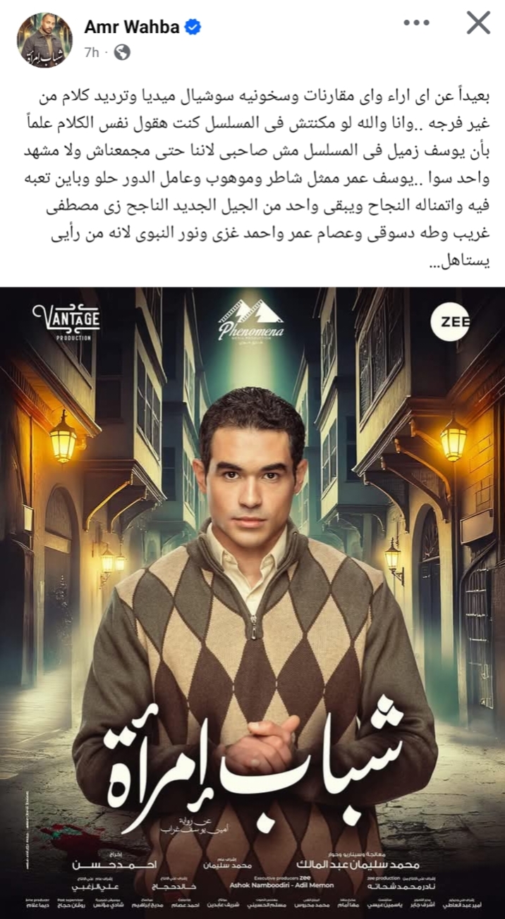 وكتب عمرو وهبة من خلال حسابه الرسمي عبر موقع التواصل الاجتماعي "فيسبوك"، قال:" بعيداً عن اى اراء واى مقارنات وسخونيه سوشيال ميديا وترديد كلام من غير فرجه ..وانا والله لو مكنتش فى المسلسل كنت هقول نفس الكلام علماً بأن يوسف زميل فى المسلسل مش صاحبى لاننا حتى مجمعناش ولا مشهد واحد سوا".