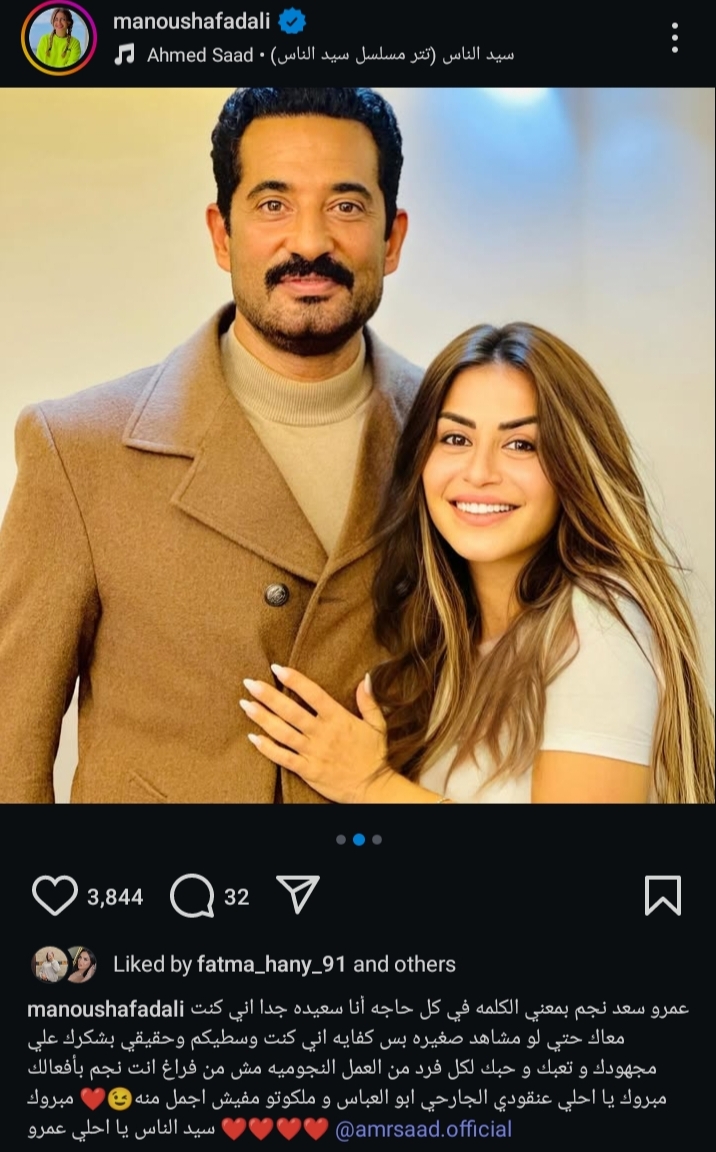 مسلسل سيد الناس.. وجهت الفنانة منه فضالي رسالة شكر للفنان عمرو سعد، بعد مشاركتها معه في مسلسل سيد الناس الذي يعرض ضمن مسلسلات رمضان 2025.