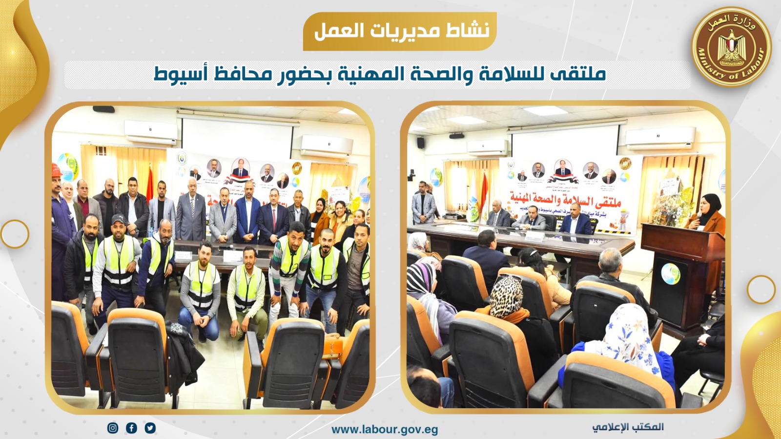 نظمت مديرية عمل أسيوط ملتقى السلامة والصحة المهنية تحت رعاية الوزير محمد جبران وزير العمل وبحضور ورعاية اللواء هشام أبو النصر محافظ أسيوط، وذلك بمقر الشركة القابضة لمياه الشرب والصرف الصحي بأسيوط، وبحضور علي سيد مدير المديرية والمهندس بهاء أبو النجا نائب رئيس مجلس الإدارة.