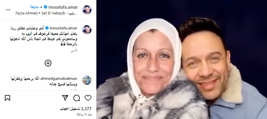 ونشر مصطفي قمر فيديو بالذكاء الاصطناعي برفقة والدته عبر صفحته الرسمية "إنستجرام" وكتب " أمي وحشتني معلش ربنا يخلي امهاتكم جميعا فرحوهم في اليوم ده وسامحوني بقي عيدها في الجنة باذن الله ادعو لها بالرحمة".