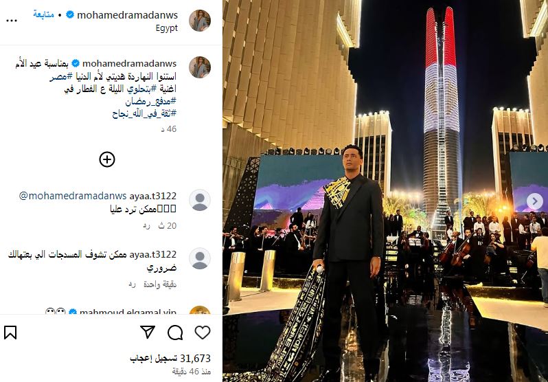 ونشر رمضان صور له ببدلة سوداء وعلق عليها "بمناسبة عيد الأم استنونا النهاردة هديتي لأم الدنيا مصر، اغنية بتحلوي الليلة ع الفطار في مدفع رمضان".