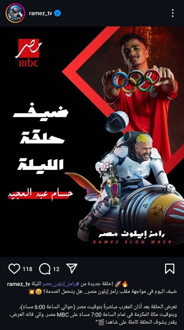 وأعلن الفنان رامز جلال عن استضافته لـ حسام عبد المجيد، وذلك من خلال حسابه الرسمي عبر موقع تبادل الصور والفيديوهات القصيرة "إنستجرام"، وعلق: “حلقة جديدة من رامز إيلون مصر الليلة .. ضيف اليوم في مواجة مقلب رامز إيلون مصر .. هل يتحمل الصدمة؟”.