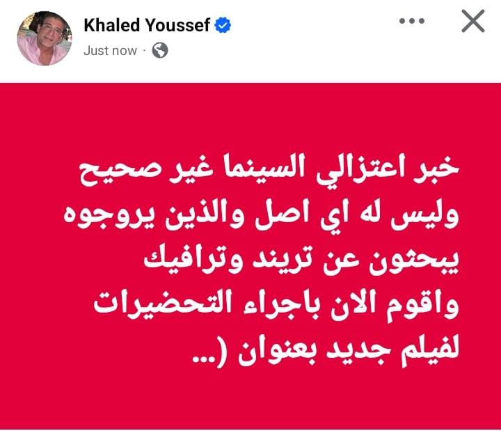 وكتب خالد يوسف من خلال حسابه الرسمي عبر موقع التواصل الاجتماعي "فيسبوك": “خبر اعتزالي السينما غير صحيح وليس له اي اصل والذين يروجوه يبحثون عن تريند وترافيك”.