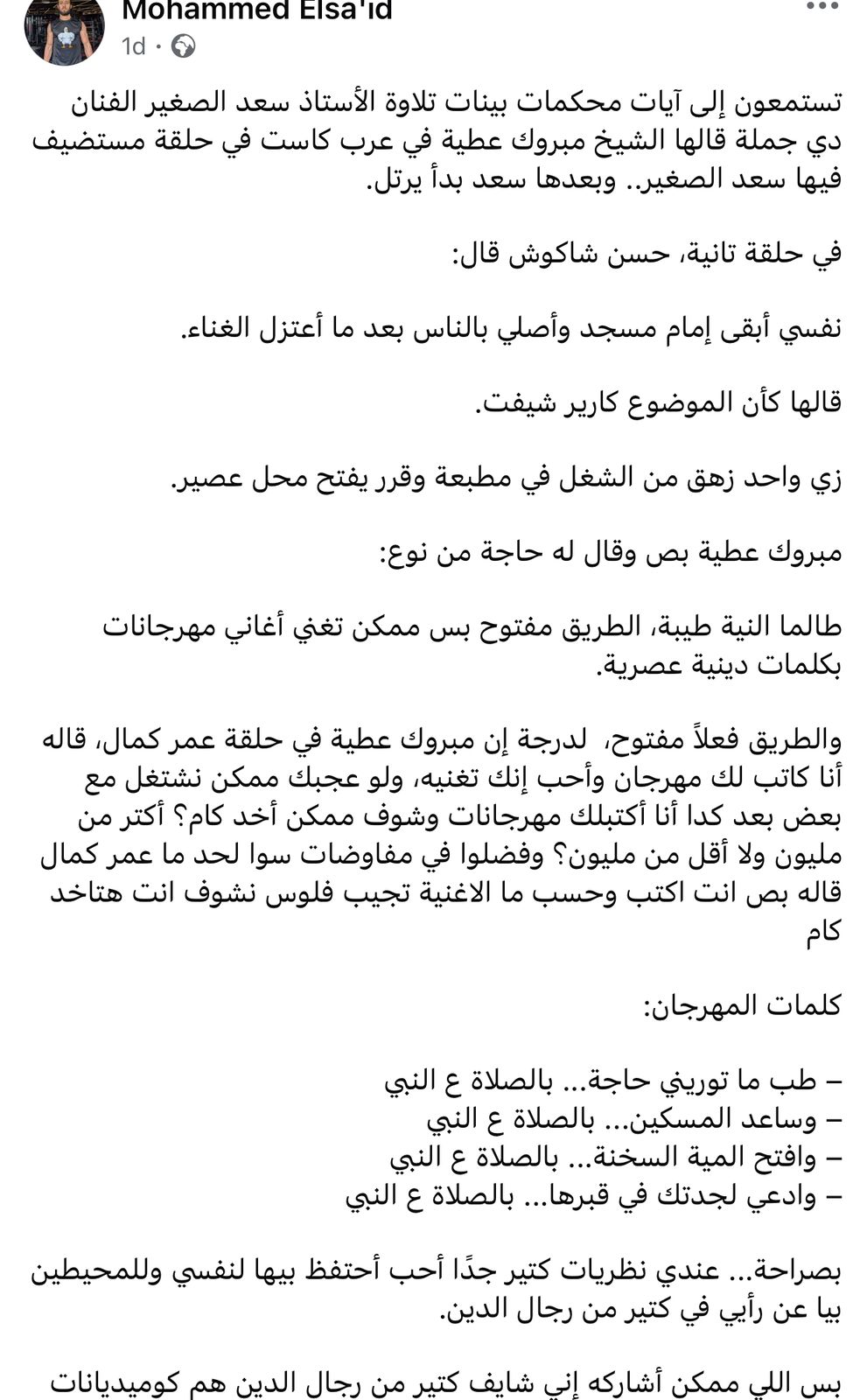 وقال أحد المتابعين،" دي جملة قالها الشيخ مبروك عطية في عرب كاست في حلقة مستضيف فيها سعد الصغير.. وبعدها سعد بدأ يقرأ سورة الإخلاص بطريقة الغناء. ..في حلقة تانية، حسن شاكوش قال: نفسي أبقى إمام مسجد وأصلي بالناس بعد ما أعتزل الغناء.. فا مبروك عطية بص وقال له حاجة من نوع: طالما النية طيبة، الطريق مفتوح بس ممكن تغني أغاني مهرجانات بكلمات دينية عصرية.