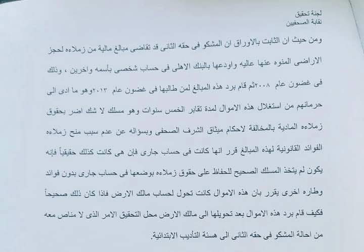 وبشأن سير التحقيقات؛ فمن الثابت بالأوراق أن محمد خراجة تقاضى مبالغ مالية من زملاءه لحجز الأراضي المنوه عنها وأودعها بالبنك الأهلي في حساب شخصى باسمه وآخرين، ثم قام برد هذه المبالغ لمن طالبها؛ وهو ما أدى إلى حرمانهم من استغلال هذه الأموال لمدة تقارب الخمس سنوات، وهو مسلك لا شك أضر بحقوق زملاءه المادية بالمخالفة لأحكام ميثاق الشرف الصحفي.