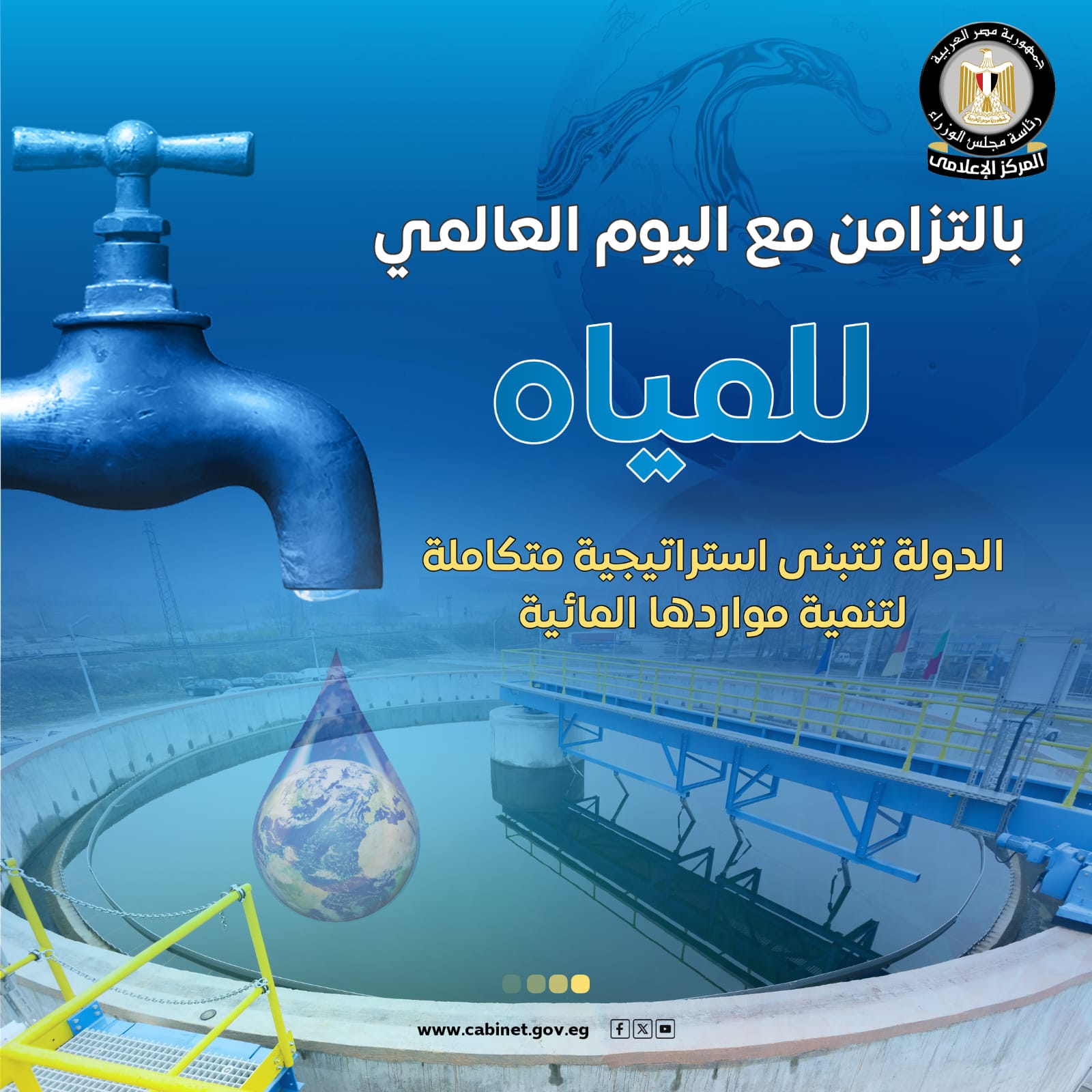 نشر المركز الإعلامي لمجلس الوزراء، عددًا من الإنفوجرافات على منصاته بمواقع التواصل الاجتماعي، حول جهود الدولة المصرية لتنمية مواردها المائية، وذلك تزامنًا مع اليوم العالمي للمياه، خاصة بعد تنفيذ مشروعات كبرى خلال السنوات الماضية في مجالات تحلية ومعالجة المياه، وتأهيل وتطوير المنشآت المائية، وزيادة كفاءة توزيع المياه، وغيرها من المشروعات.