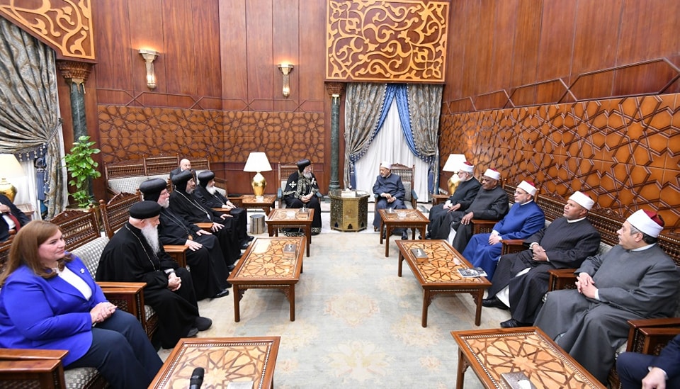 ومن جهته شكر الدكتور أحمد الطيب قداسة البابا معربًا عن تقديره لهذه الزيارة، مؤكدًا على المودة والأخوة بين المصريين جميعًا، معربًا عن ترحيبه بأن نقف معًا كرجال دين في مواجهة انتشار الكراهية وكافة التحديات التي تواجه الناس، مشيرًا إلى أن التعليم هو الأداة الأولى لمعالجة مشكلة الكراهية.
