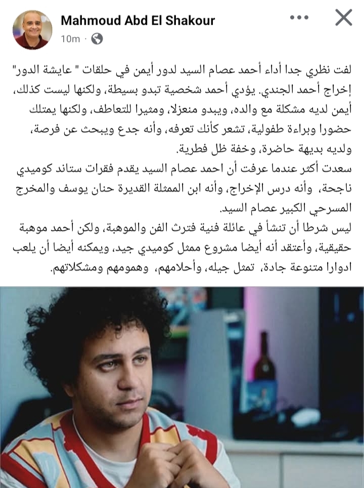 وتابع: “سعدت أكثر عندما عرفت أن احمد عصام السيد يقدم فقرات ستاند كوميدي ناجحة، وأنه درس الإخراج، وأنه ابن الممثلة القديرة حنان يوسف والمخرج المسرحي الكبير عصام السيد”.