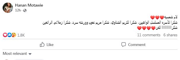 ووجهت حنان رسالة لصناع العمل عبر صفحتها الرسمية "فيس بوك" وكتبت " لام شمسية..شكرا لأسرة المسلسل الواعيين، شكرا لكريم الشناوي، شكرا مريم نعوم وورشة سرد، شكرا زملائي الرائعين ،شكرااااااااااا للفن ".