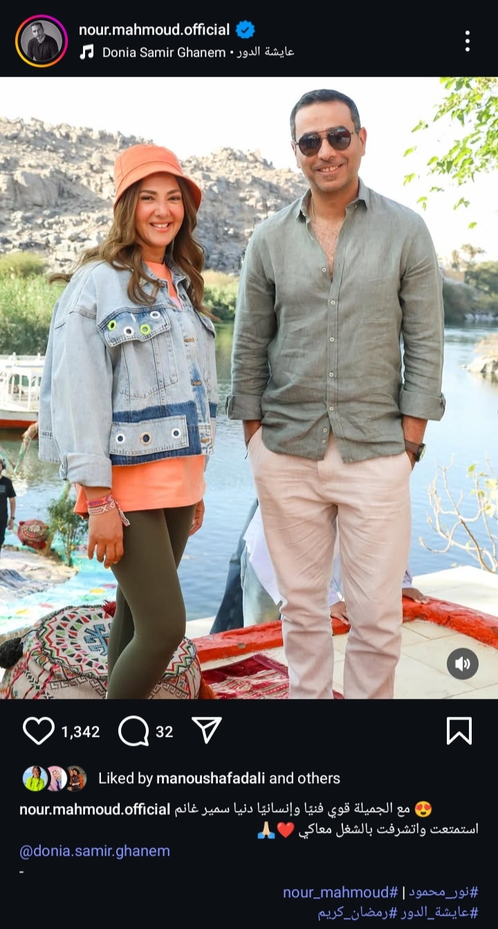 ونشر نور محمود صوره تجمعه بالفنانة دنيا سمير غانم أثناء كواليس مسلسل عايشة الدور، وذلك من خلال حسابه الرسمي عبر موقع تبادل الصور والفديوهات القصيرة "إنستجرام"، وكتب:" مع الجميلة قوي فنيًا و إنسانيًا دنيا سمير غانم.. استمتعت واتشرفت بالشغل معاكي".