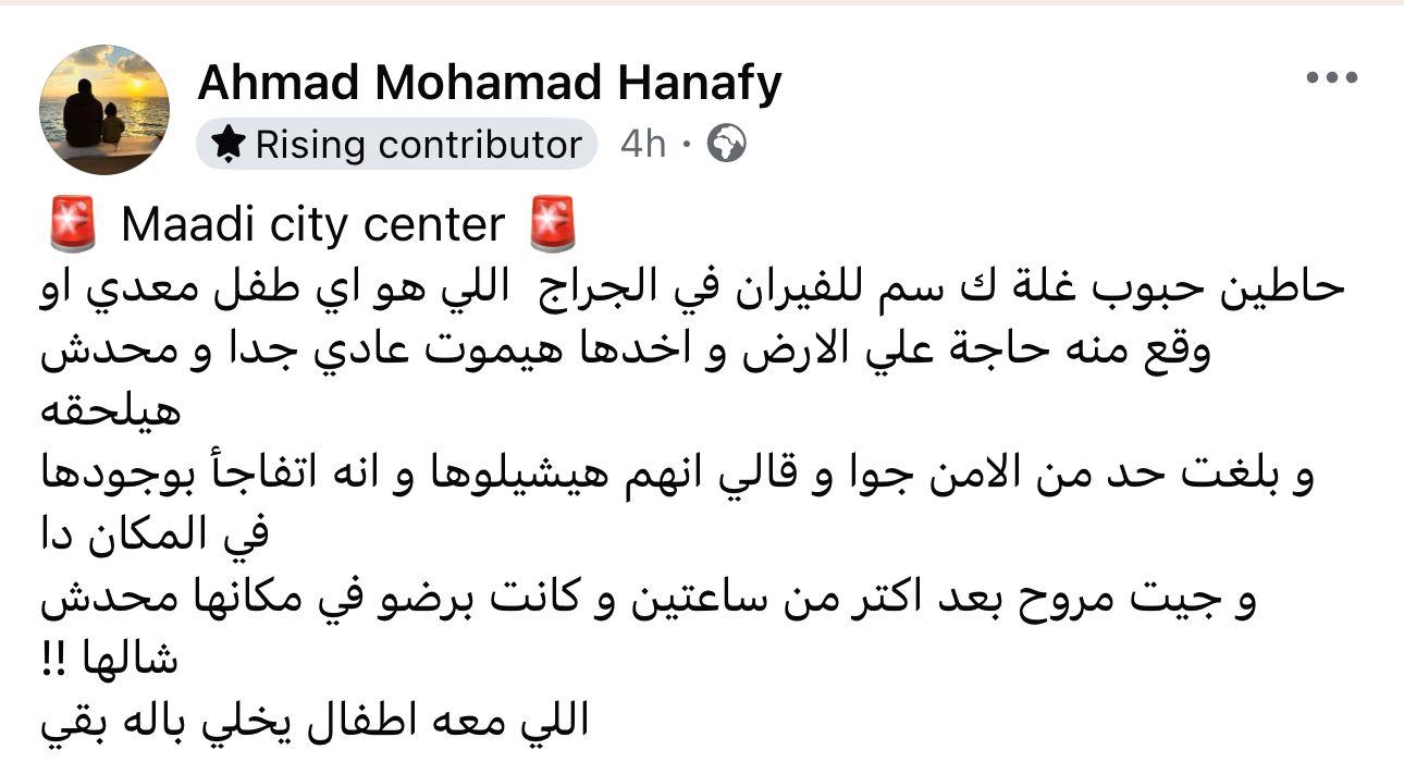 وقال صاحب المنشور محذرا،" Maadi city center حاطين حبوب غلة ك سم للفيران في الجراج اللي هو اي طفل معدي او وقع منه حاجة علي الارض و اخدها هيموت عادي جدا و محدش هيلحقه وبلغت حد من الامن جوا و قالي انهم هيشيلوها و انه اتفاجأ بوجودها في المكان دا".