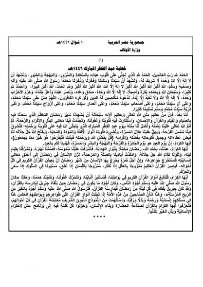 أعلنت وزارة الأوقاف نص خطبة عيد الفطر المبارك، وذلك عبر صفحتها الرسمية على موقع التواصل الاجتماعي “فيسبوك”.