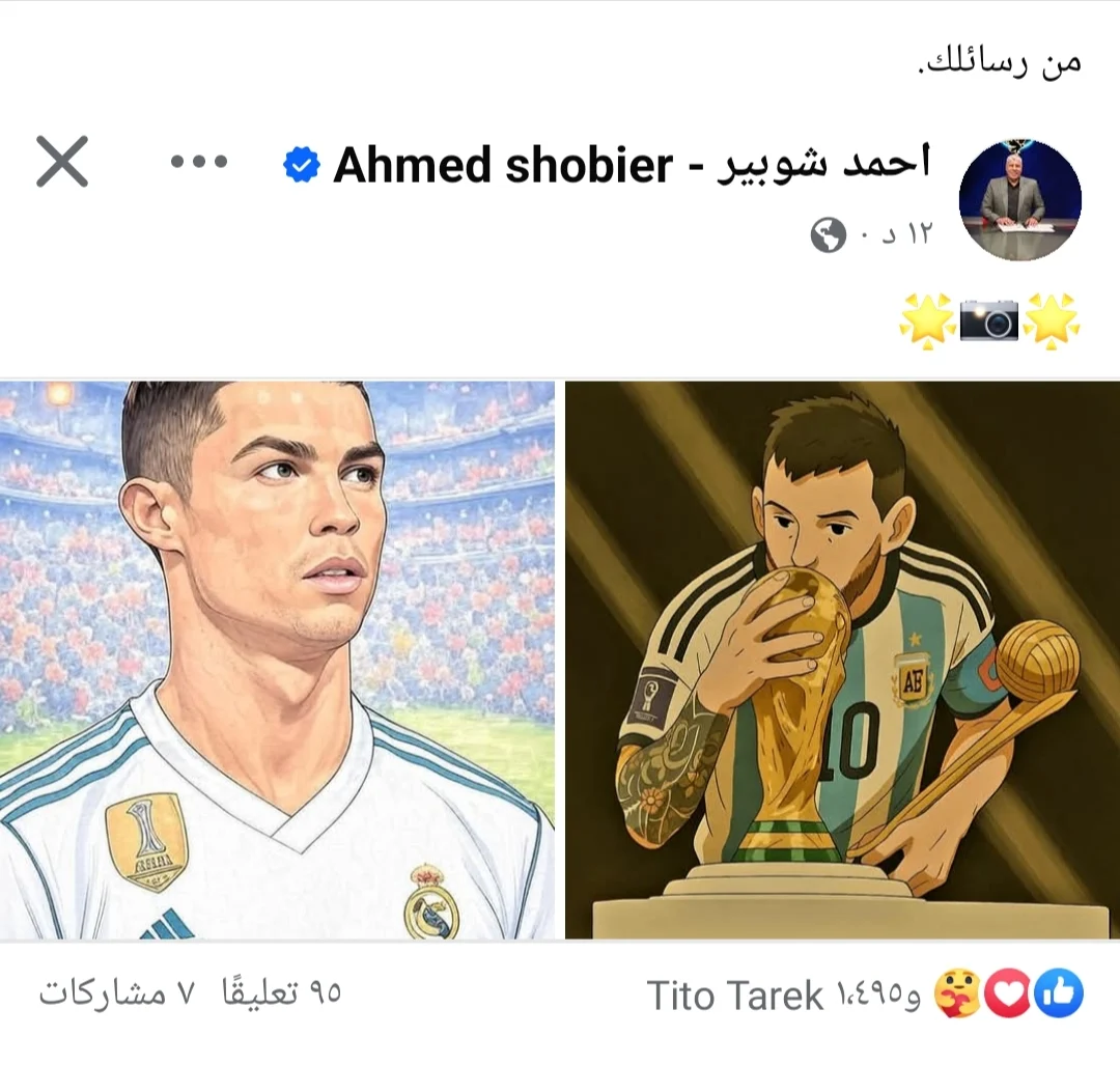 وكتب شوبير عبر حسابه الرسمي على موقع "فيسبوك" منشورًا يتضمن صورة لليونيل ميسي وأخرى لرونالدو، مما دفع المتابعين للتساؤل عما إذا كانت هذه إشارة إلى احتمال مواجهة الأهلي لفريق إنتر ميامي الأمريكي، الذي يضم ميسي في صفوفه، في البطولة المقبلة.