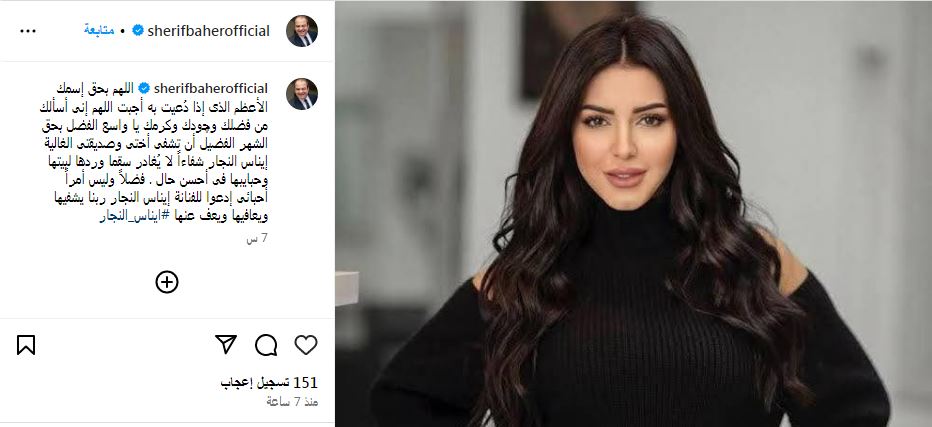 وكتب شريف باهر عبر صفحاته الرسمية على مواقع التواصل الاجتماعية المختلفة " اللهم بحق اسمك الأعظم الذي إذا دُعيت به أجبت اللهم إنى أسألك من فضلك وچودك وكرمك يا واسع الفضل بحق الشهر الفضيل أن تشفى أختى وصديقتى الغالية إيناس النجار شفاءاً لا يُغادر سقما ويردها لبيتها وحبايبها فى أحسن حال . فضلاً وليس أمراً أحبائى إدعوا للفنانة إيناس النجار ربنا يشفيها ويعافيها ويعفو عنها ايناس النجار".