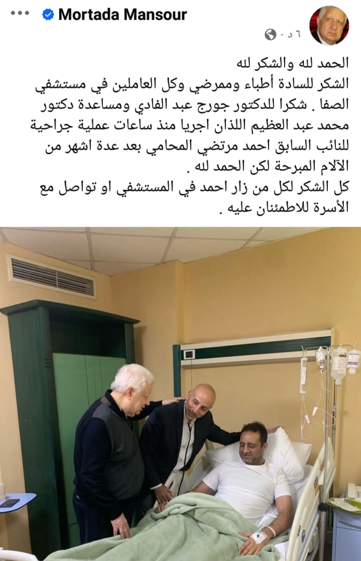 وتابع منصور: شكرا للدكتور جورج عبد الفادي ومساعدة دكتور محمد عبد العظيم اللذان اجريا منذ ساعات عملية جراحية للنائب السابق احمد مرتضي المحامي بعد عدة اشهر من الآلام المبرحة لكن الحمد لله.