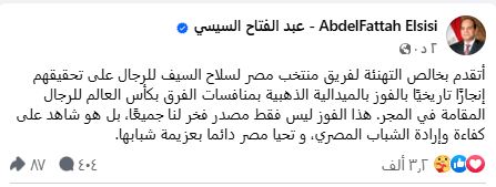 تقدم الرئيس عبد الفتاح السيسي، بخالص التهنئة لمنتخب مصر لسلاح السيف للرجال، بعد تحقيقه إنجازًا تاريخيًا بالفوز بالميدالية الذهبية في منافسات الفرق بكأس العالم للرجال، التي أقيمت في المجر.