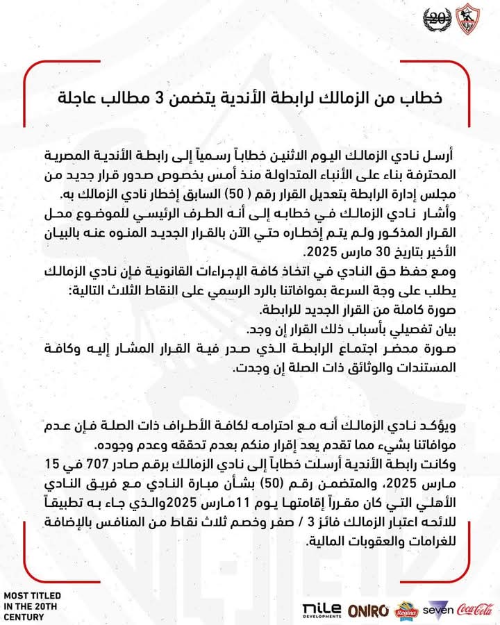 وكانت رابطة الأندية أرسلت خطاباً إلى نادي الزمالك برقم صادر 707 في 15 مارس 2025، والمتضمن رقم (50) بشأن مبارة النادي مع فريق النادي الأهلي التي كان مقرراً إقامتها يوم 11 مارس 2025 والذي جاء به تطبيقاً للائحه اعتبار الزمالك فائز 3 / صفر وخصم ثلاث نقاط من المنافس بالإضافة للغرامات والعقوبات المالية.