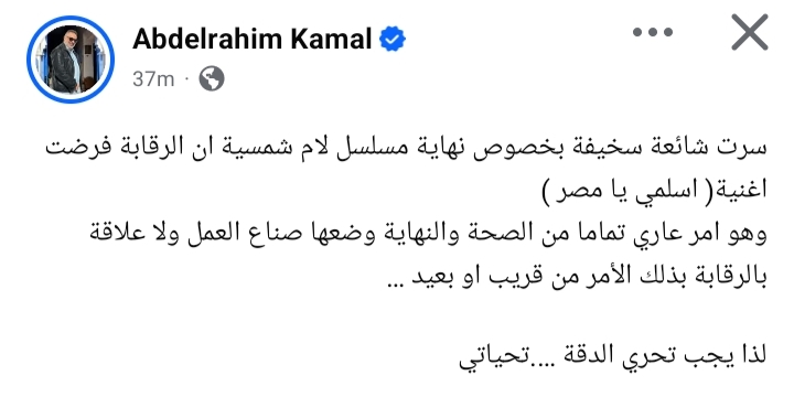 وكتب عبد الرحيم كمال من خلال حسابه الرسمي عبر موقع التواصل الاجتماعي فيسبوك، وقال: " سرت شائعة سخيفة بخصوص نهاية مسلسل لام شمسية ان الرقابة فرضت اغنية (اسلمي يا مصر).