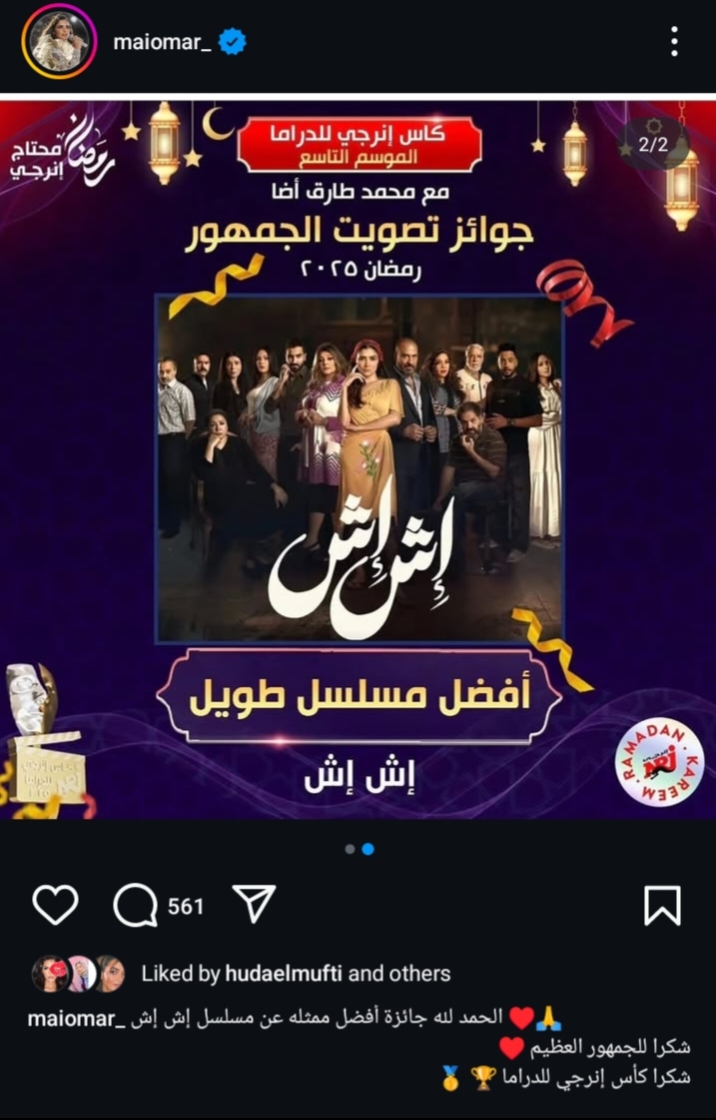فاز مسلسل إش إش بطولة الفنانة مي عمر كأفضل مسلسل طويل في دراما رمضان 2025 بجائزة كاس إنرجي للدراما.