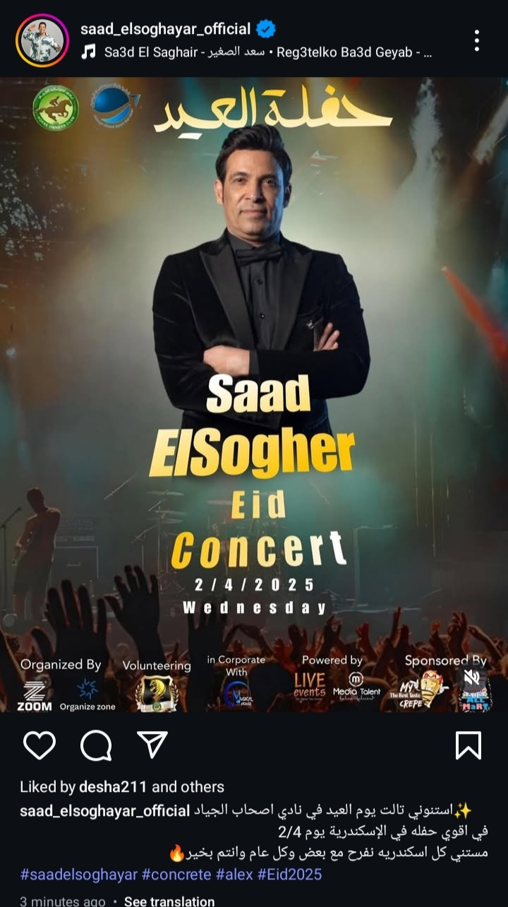 الفنان سعد الصغير.. يستعد مطرب المهرجانات سعد الصغير لإحياء حفل غنائي ضخم في الإسكندرية إحتفالًا بعيد الفطر المبارك.