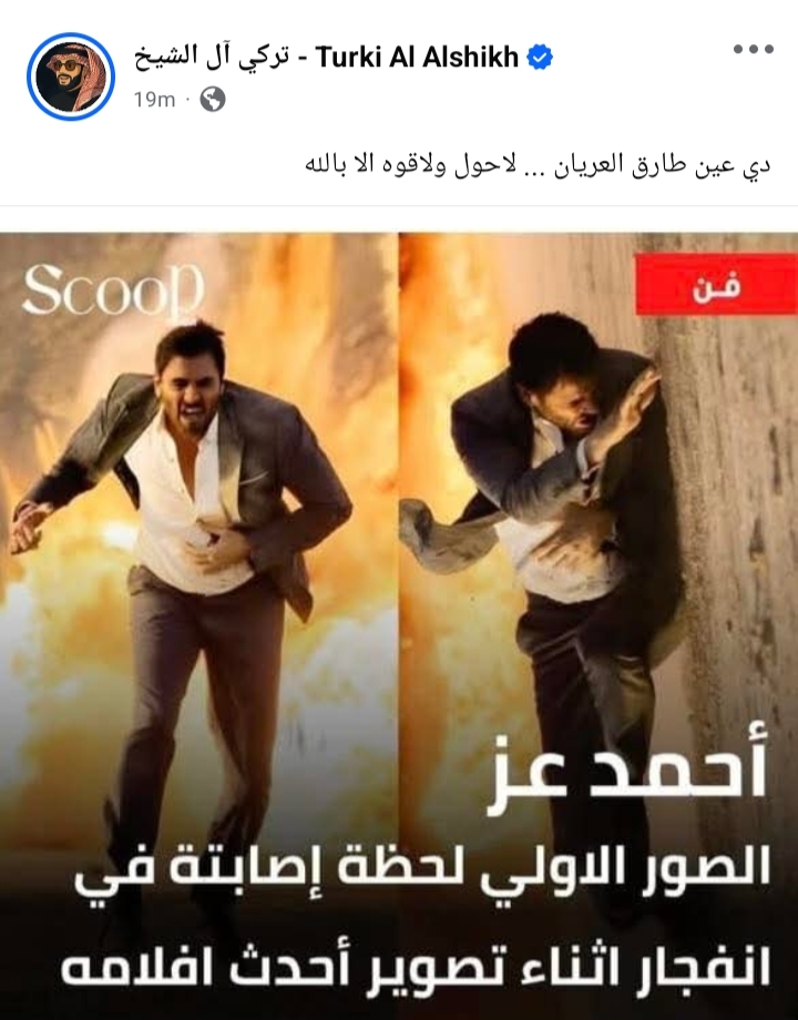وبعد هذا الحادث المروع نشر تركي آل الشيخ صورة أحمد عز خلال الحادث، من خلال حسابه الرسمي عبر موقع التواصل الاجتماعي "فيسبوك"، وعلق:" دي عين طارق العريان.. لا حول ولا قوة إلا بالله".