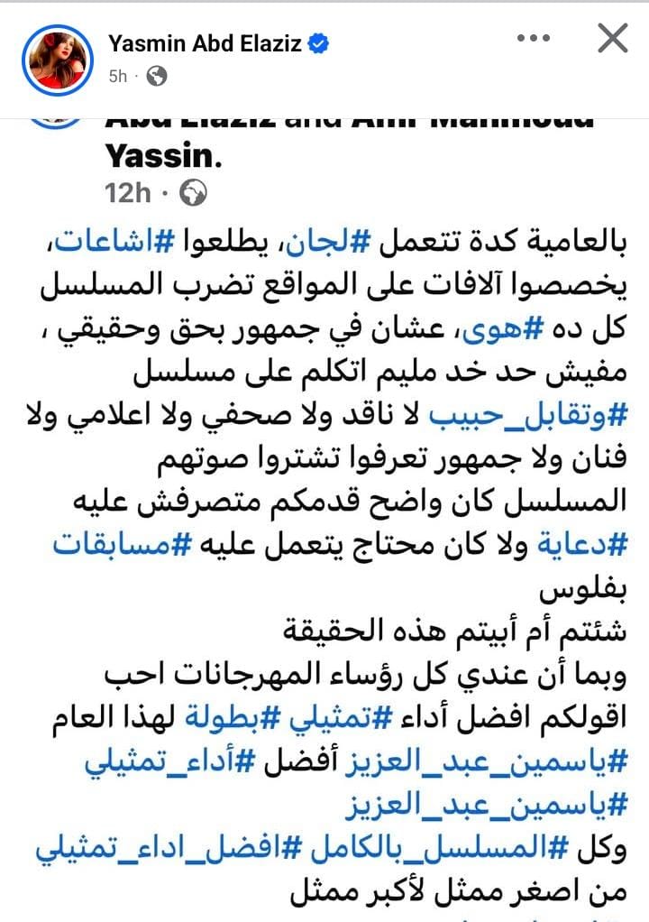 لتنشر ياسمين صورة تعلن من خلالها حصولها على جائزة أفضل ممثلة في دراما رمضان بتصويت الجمهور، قائلة "الحمدلله تصويت الجمهور الحقيقي الحمدلله".