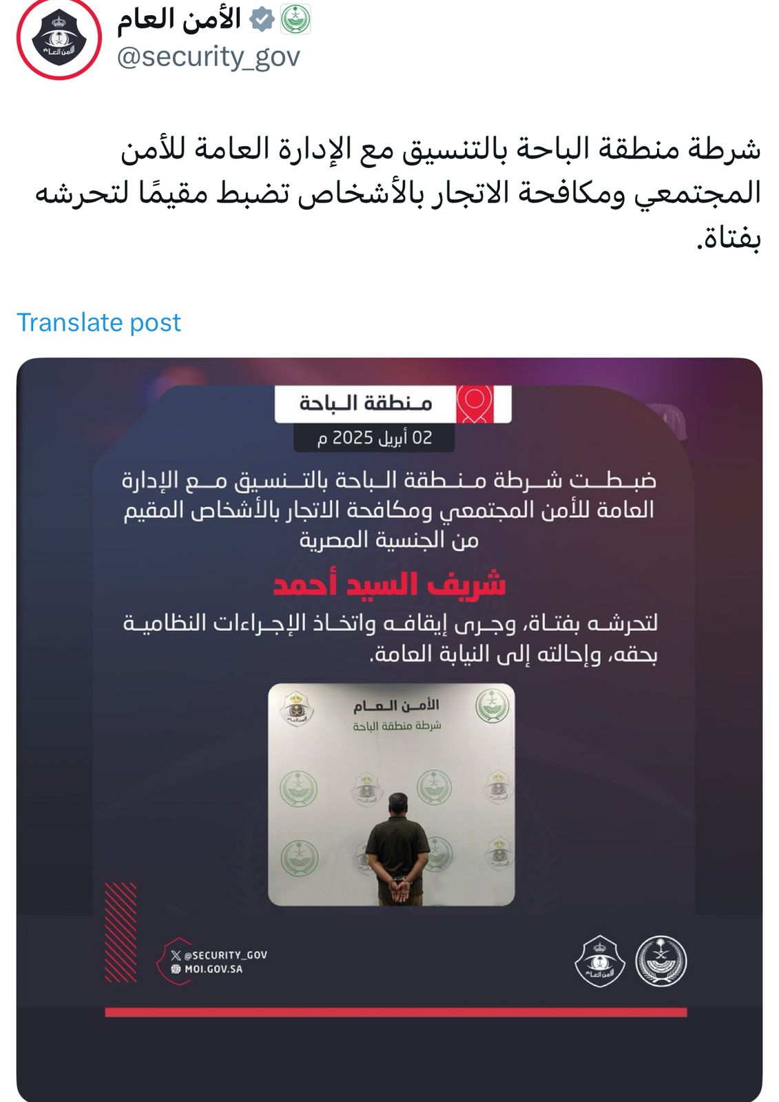 وقال الأمن العام السعودي، أن شرطة منطقة الباحة بالتنسيق مع الإدارة العامة للأمن المجتمعي ومكافحة الاتجار بالأشخاص تضبط مقيمًا لتحرشه بفتاة وهو من الجنسية المصرية