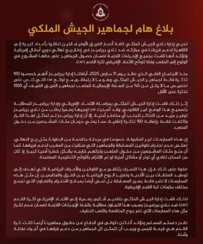 تحيي إدارة نادي الجيش الملكي كافة أنصار الفريق الأوفياء الذين تنقلوا بأعداد كبيرة إلى القاهرة لدعم فريقنا في مباراته ضد نادي بيراميدز في إطار ربع نهائي دوري أبطال إفريقيا وتؤكد أنها قامت بجميع الإجراءات اللازمة لضمان حصول الجماهير على حلها المشروع في الولوج إلى الملعب وفقا للواقع الاتحاد الإفريقي لكرة القدم (۲۸۴).
