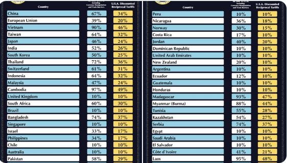 كما فرض ترامب رسوما جمركية قدرها 34% على الصين، و20% على الاتحاد الأوروبي، و46% على فيتنام، 32% على تايوان، كما فرض رسوماً قدرها 24% على اليابان، و10% على بريطانيا، و25% على كوريا الجنوبية.