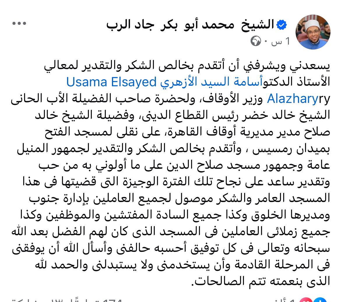 وعبر صفحته الرسمية بالفيسبوك أعرب الشيخ محمد أبو بكر عن خالص شكره وتقديره لوزير على هذه الثقة الغالية، كما وجه الشكر لصاحب الفضيلة الشيخ خالد خضر، رئيس القطاع الديني، وفضيلة الشيخ خالد صلاح، مدير مديرية أوقاف القاهرة، على دعمهم المستمر لجهود الأئمة في نشر تعاليم الدين الحنيف.