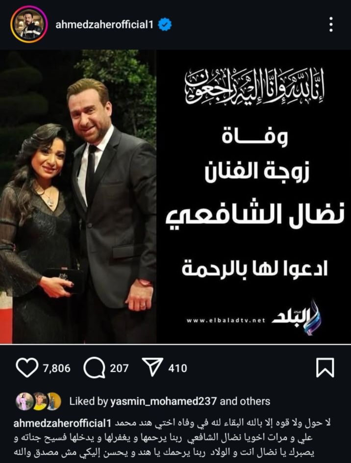 أحمد زاهر ينعي زوجة الفنان نضال الشافعي