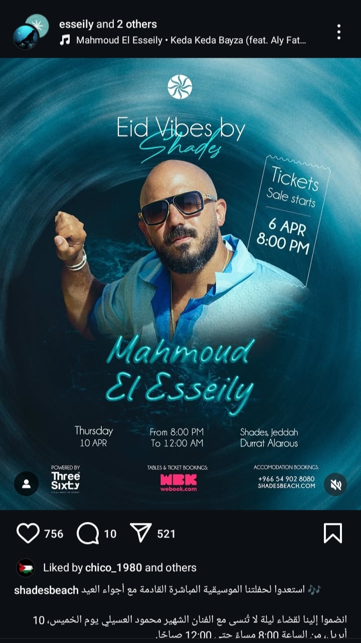 وأضاف:" انضموا إلينا لقضاء ليلة لا تُنسي مع الفنان الشهير محمود العسيلي يوم الخميس 10 أبريل من الساعة 8:00 مساء حتي 12:00 صباحًا".