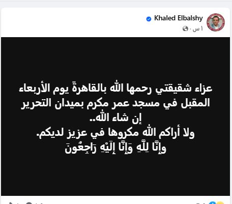 وقال الكاتب الصحفي خالد البلشي عبر صفحته الرسمية على موقع التواصل الاجتماعي “فيسبوك”: "عزاء شقيقتي رحمها الله بالقاهرةً يوم الأربعاء المقبل في مسجد عمر مكرم بميدان التحرير إن شاء الله.. ولا أراكم الله مكروها في عزيز لديكم.. وإِنَّا لِلَّهِ وَإِنَّا إِلَيْهِ رَاجِعُونَ.