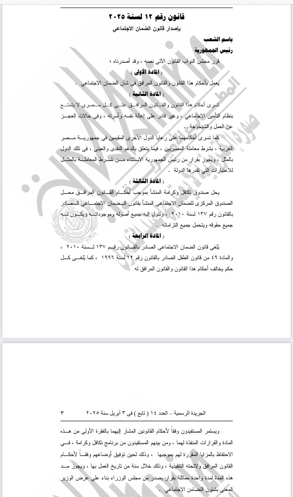نشرت الجريدة الرسمية قرارا جمهوريا بحل صندوق تكافل وكرامة محل الصندوق المركزي للضمان الاجتماعي.