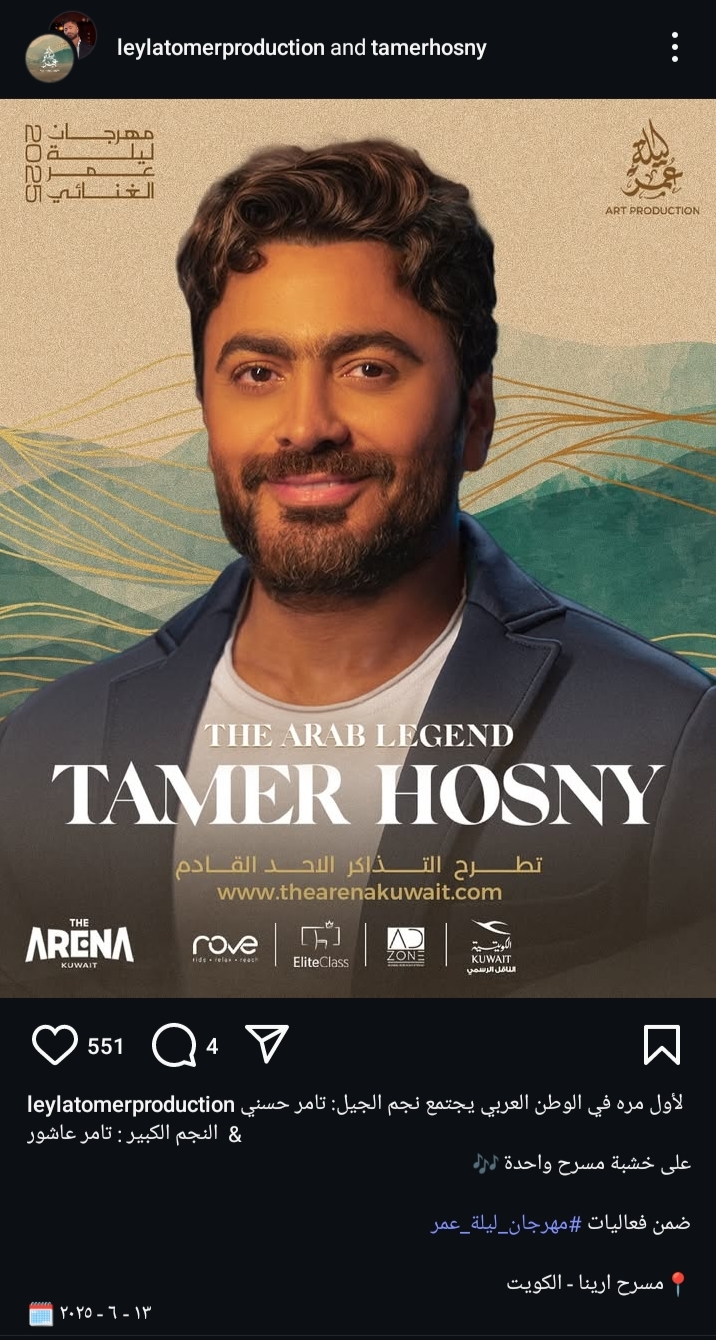 ومن المقرر إقامة الحفل يوم 14 يونيو المقبل 2025، وذلك علي مسرح أرينا الكويت ضمن فاعليات مهرجان ليلة العمر.