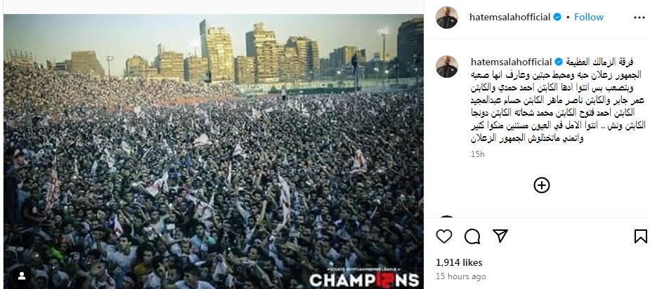 "اتمني ماتخذلوش الجمهور"..رسالة قوية من حاتم صلاح لفريق الزمالك (صورة)