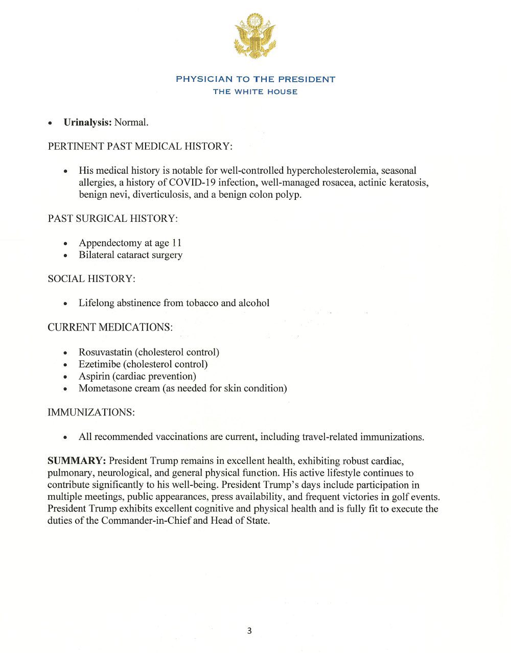 وأشارت المذكرة إلى أن "مفاصل وعضلات الرئيس تتمتع بنطاق كامل من الحركة"، بينما أرجعت صحته الجيدة إلى نمط حياته النشط، بما في ذلك "الانتصارات المتكررة في أحداث الجولف".