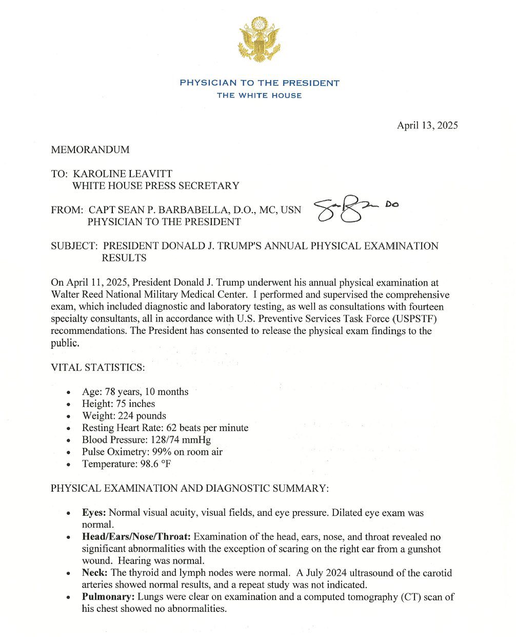 وكتب الدكتور باربابيلا في المذكرة التي أصدرها البيت الأبيض يوم الأحد: "يتمتع الرئيس ترامب بصحة بدنية وإدراكية ممتازة وهو لائق تمامًا للقيام بواجبات القائد الأعلى ورئيس الدولة".
