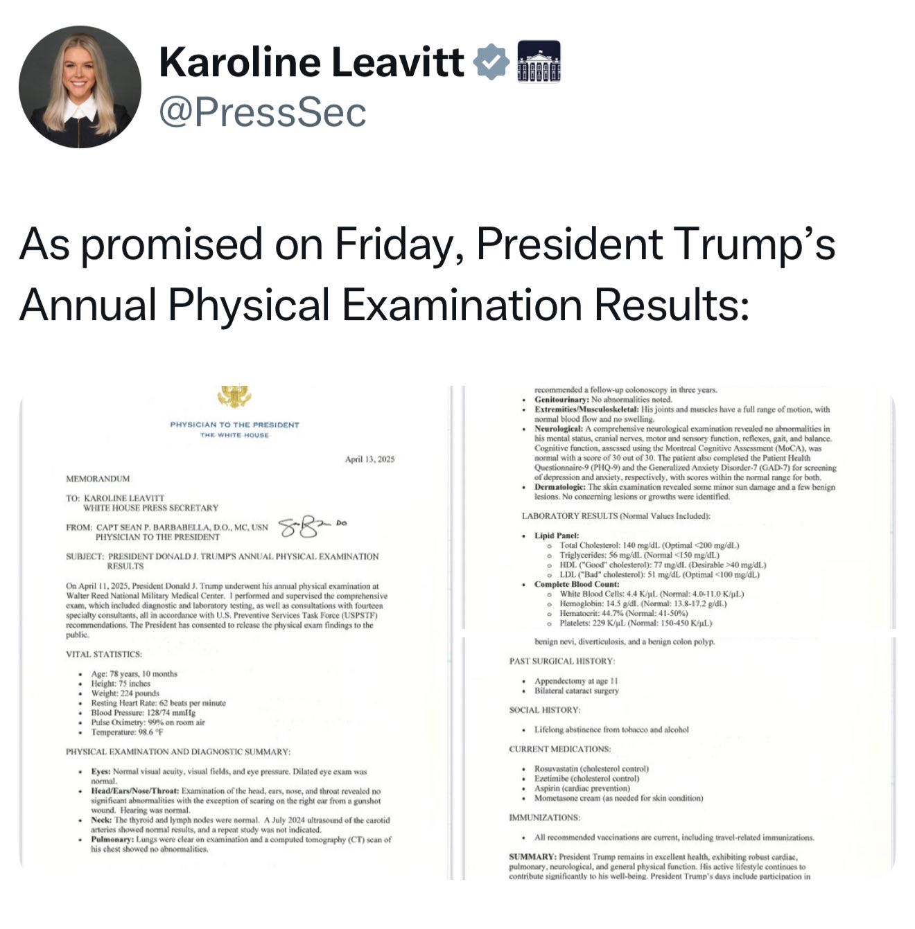 وقال طبيبه شون باربابيلا في مذكرة: "يظل الرئيس ترامب يتمتع بصحة ممتازة، ويظهر وظائف قلبية ورئوية وعصبية وجسدية عامة قوية".